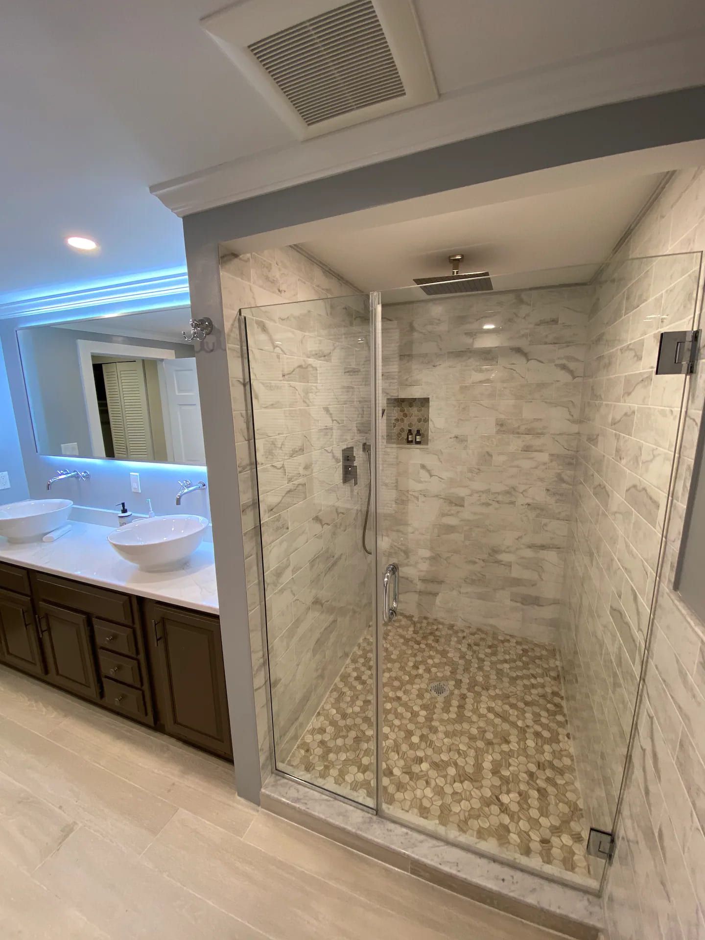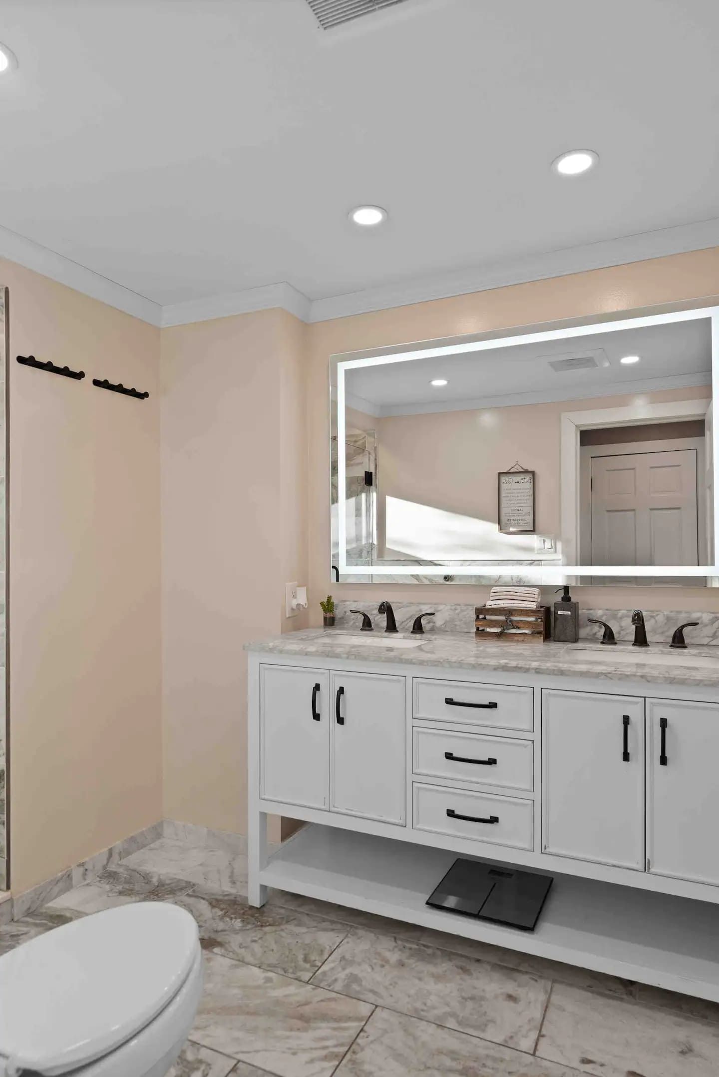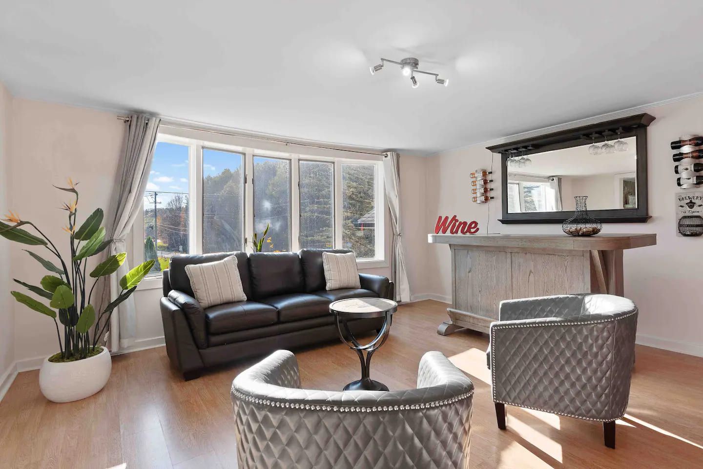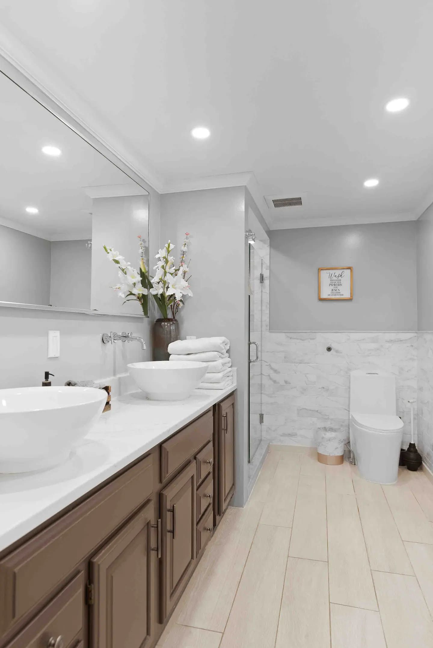 1st floor (main floor) has a huge living room space with an indoor gas fireplace surrounding with couches to relax next to the fireplace. Custom made large sectional leather sofa to sit around to enjoy and watch sports games and shows from the 70's TV for the entire family/friends. It has a wine bar lounge next to the living room. Guests can sit on the comfy couches and sip a glass of wine in the wine bar lounge. Main bathroom has a double sinks vanity, Large LED mirror, rain forest shower head and Koehler toilet. Master suite bedroom comes with a double sinks vanity bathroom. Also a queen bed bedroom is next to the master bedroom. Large dine in kitchen with granite countertops. Stainless steel appliances, commercial size kitchen sink and lots of space in the kitchen for cooking or baking. Also there is a formal dining room can sit 15 people together