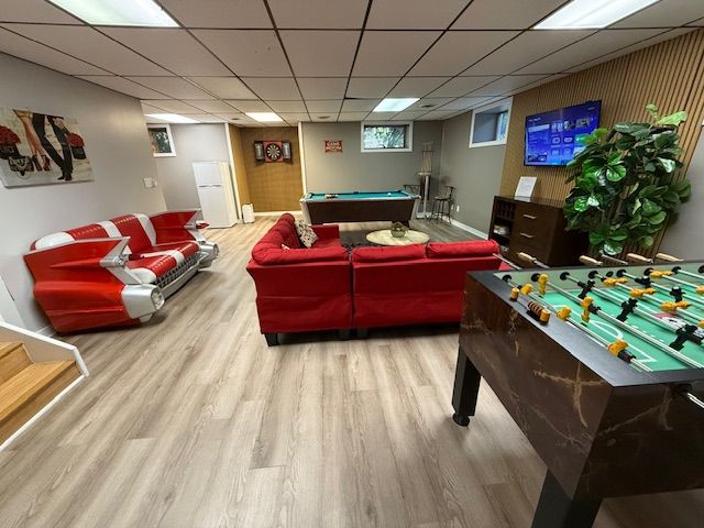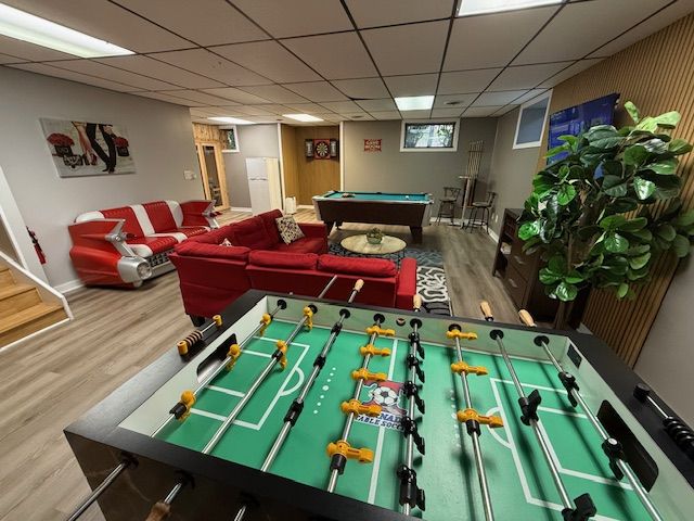 Ground floor level of the house has a 3 bunk beds bedroom with kids playing and hangout area. Next to the bedroom is the game lounge with a pool table, foosball table, dart board, entertainment center, a bunch of fun board games to play with. A 6 people cedar wood dry heat sauna to release some tension and a double shower bathroom also on the ground floor level.